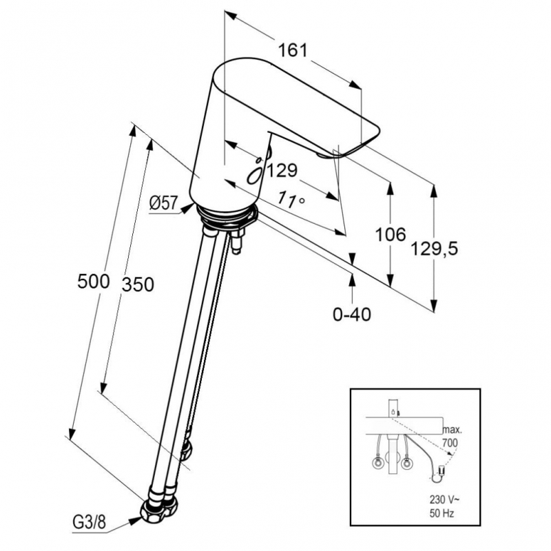 -jednootvorová montáž, prietokové množstvo 5 l/min, perlátor M 24 x 1 istený voči vandalom, magnetický ventil, s rukoväťou na nastavenie teploty, optické zachytenie predmetu, elektronický modul so zobrazením stavu, dodávka elektrického prúdu cez 230 V sieťový zdroj, bez odpadovej súpravy, rýchlo-montážny systém, flexibilné vysokotlaké hadice G 3/8, filter na zachytávanie nečistôt, stupeň hlučnosti I, chránené proti vandalizmu, pre beztlakový prietokový ohrievač.