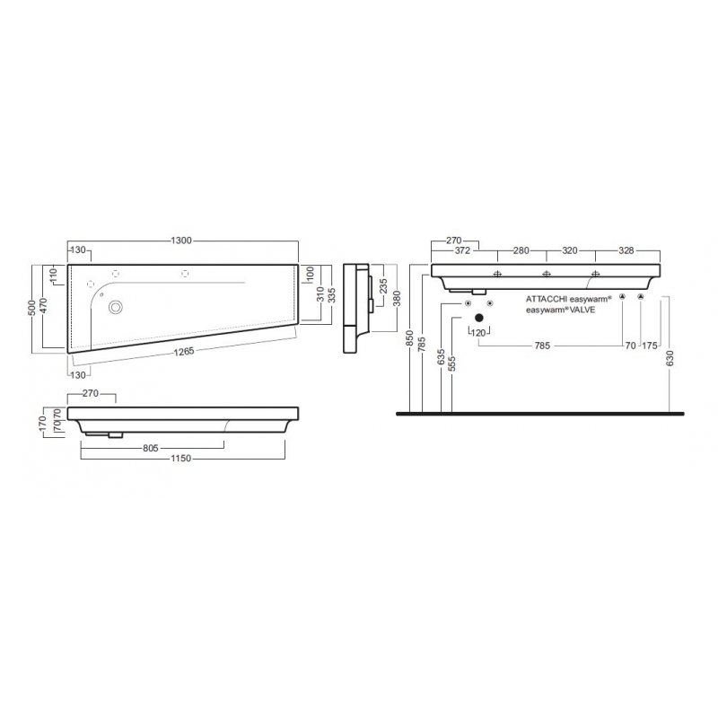 AKCIA !! HATRIA umývadlo GRANDANGOLO pravé 130 x 50 cm biele Y0XT. Bez otvoru pre batériu