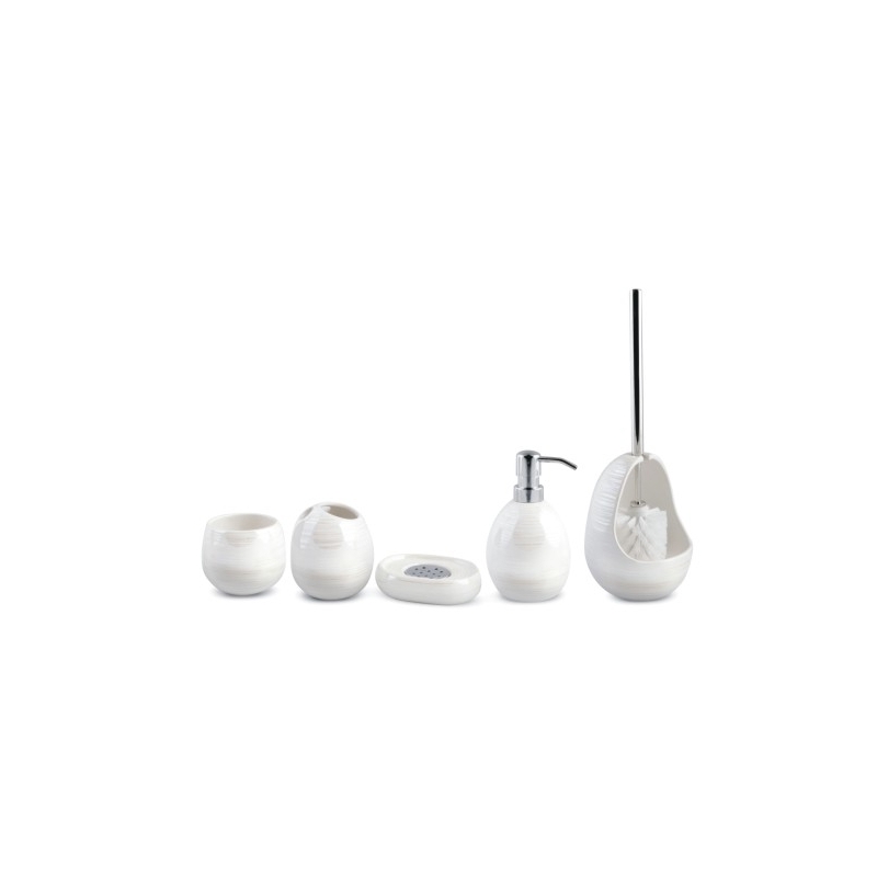 Skladá sa z: mydelnička, dávkovač na tekuté mydlo, pohárik, wc kefa a pohár na zubné kefky. Materiál: keramika