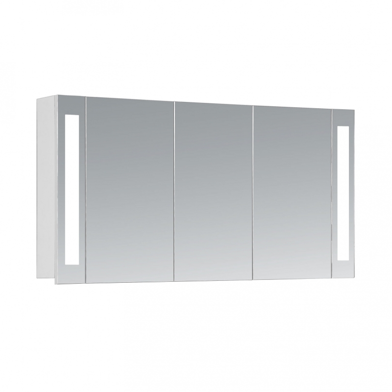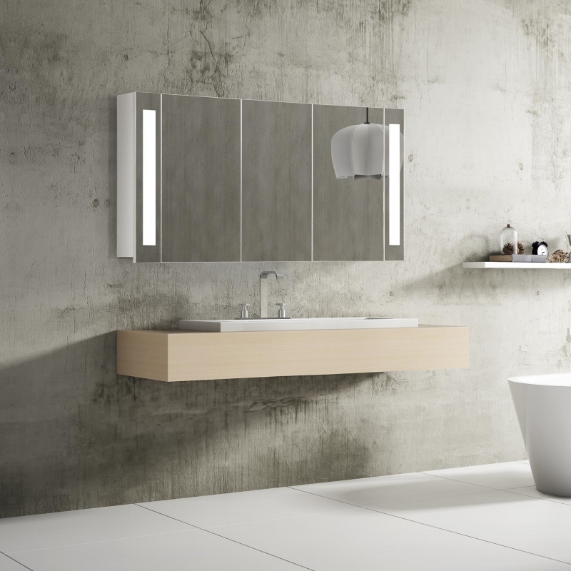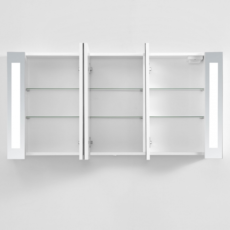 Nadčasový dizajn a veľkorysý úložný priestor. Zrkadlová skrinka pre kúpeľňu s 3 vonkajšími zrkadlovými dverami a 6 samostatnými policami z bezpečnostného skla ESG.