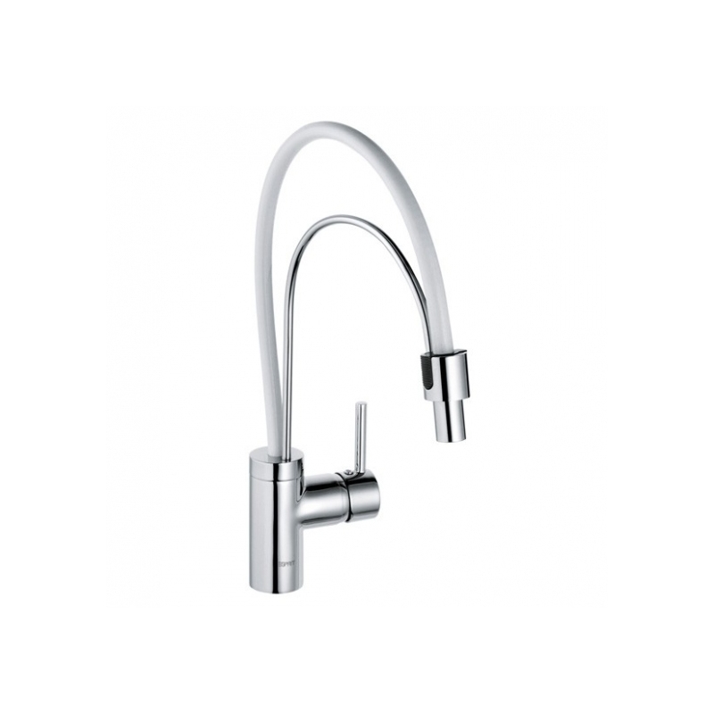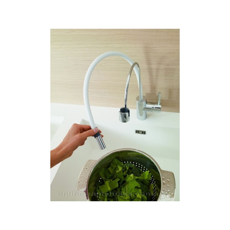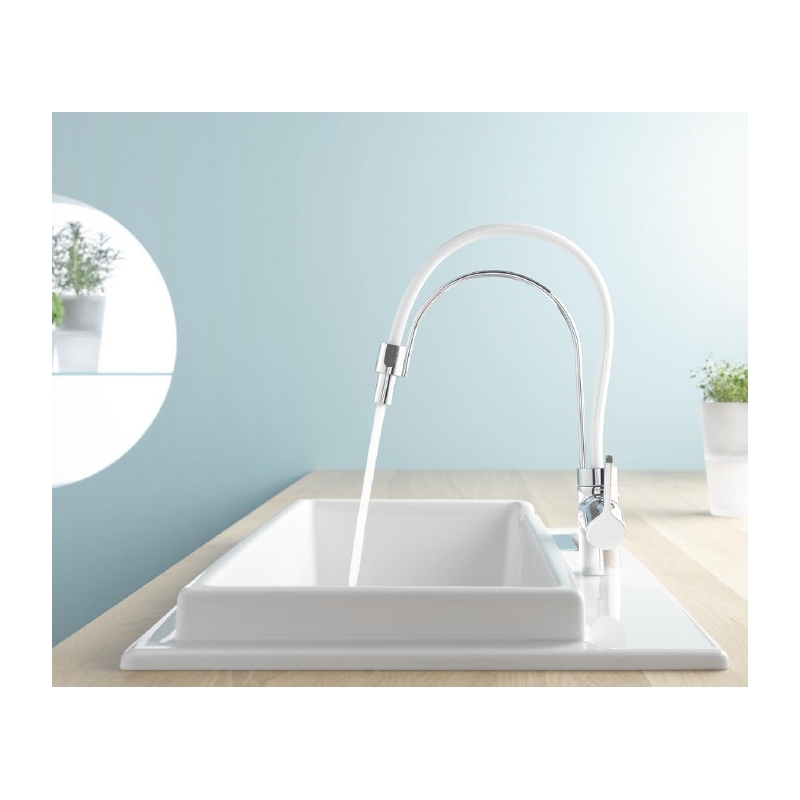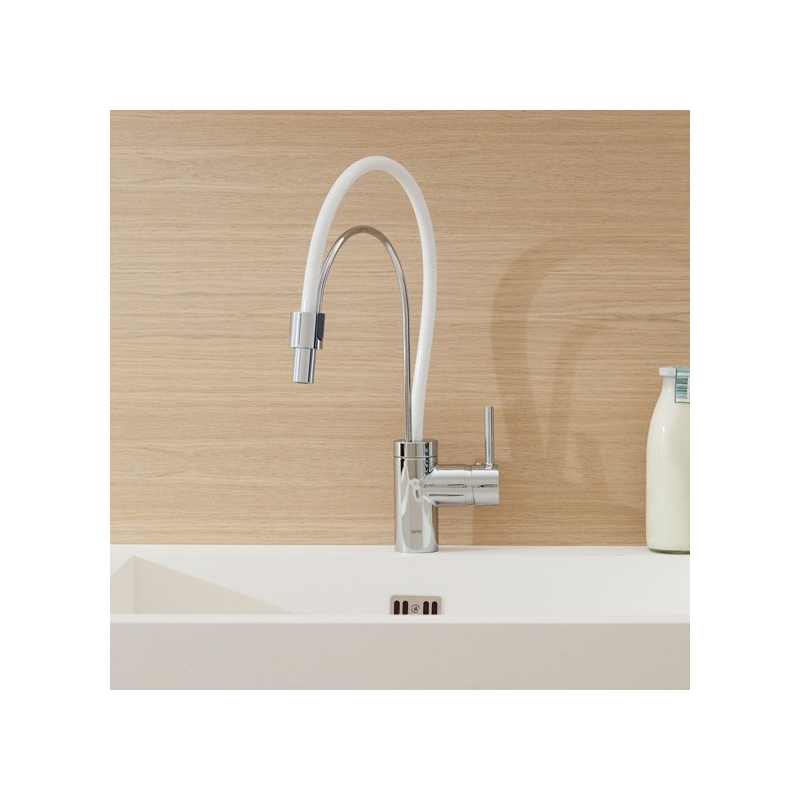 Organickú reč tvarov možno spozorovať v dvojitom oblúku s pochrómovaným ramenom a bielym, flexibilným hadicovým výtokom, ktorý znázorňuje prirodzený tok vody.