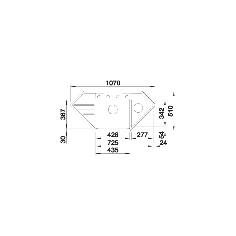Rohový drez s odkvapom s rozmermi 1070 x 510 x 190/130 mm. Drez je určený na montáž na dosku s minimálnou šírkou rohovej skrinky 90 x 90 cm. Balenie obsahuje odtokovú armatúru, 3 ½ výpusť so sitkom, 1 vyvŕtaný otvor a 3 predvŕtané otvory.