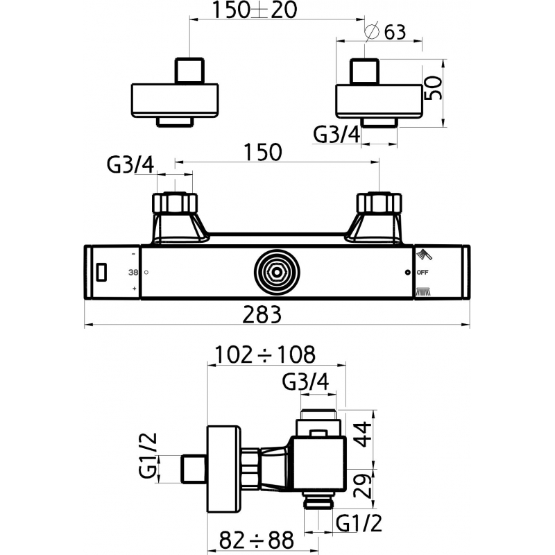 Sprchová termostatická baterie s dolním a horním vývodem 150