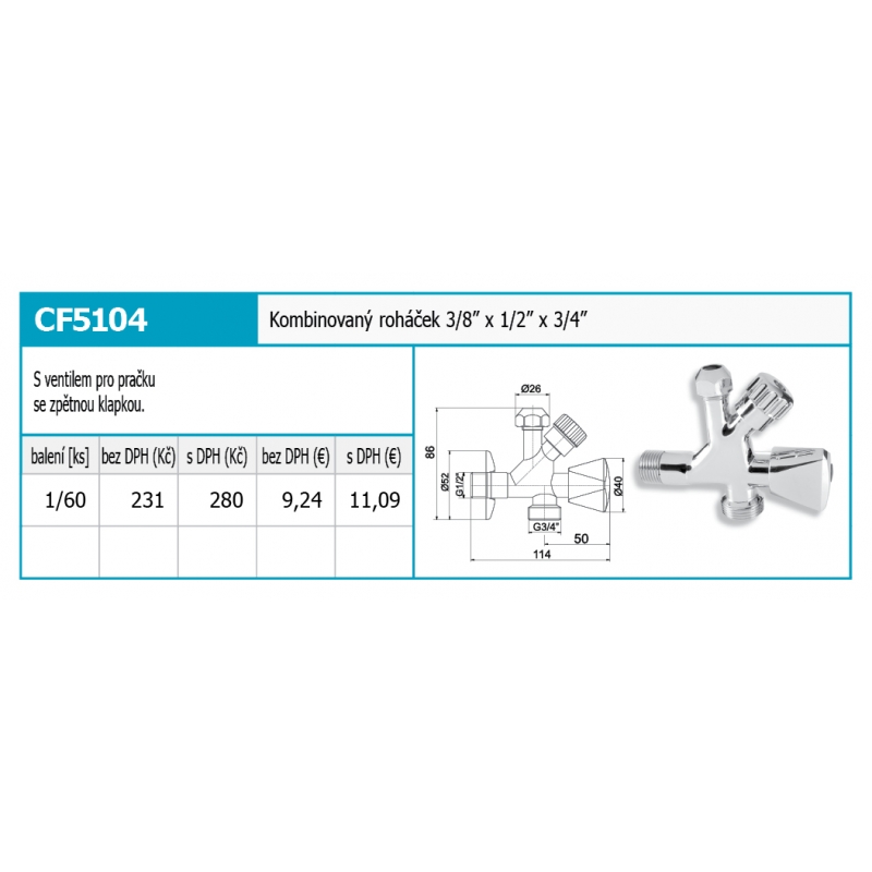 Kombinovaný roháčik s ventilom pre práčku 3/4"x1/2"x3/4"