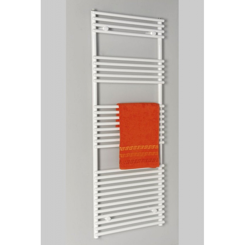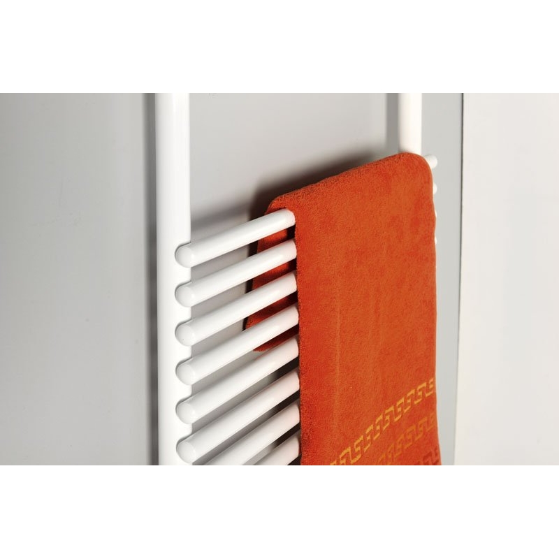 Moderný designový radiátor tvorený guľatými profily, ktoré dokonale splynú so zvislými kolektory z trubiek s kruhovým profilom pre jednoduché zavesenie uterákov.