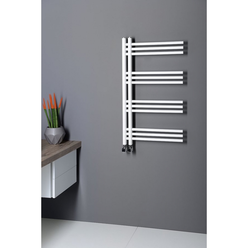 Dizajnovo tvarované kúpeľňové vykurovacie teleso s výnimočným vzhľadom je vyrobené z oceľových rúrok. U radiátora oceníte najmä jeho praktickosť, vďaka svojej konštrukcii umožňuje jednoduché a pohodlné zavesenie uterákov zo strany na horizontálne tyče. Praktická rozteč 50 mm stredového pripojenie Vám umožní kombinovať s dizajnovými ventily z našej ponuky aj v kombinácii s elektrickou vykurovacou tyčou.