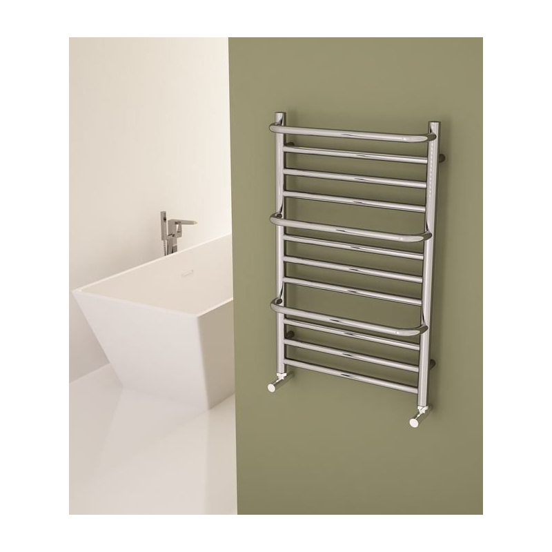 Klasické teleso vyrobené z pochrómovaných oceľových rúrok, doplnené praktickými držadlami na sušenie uterákov.