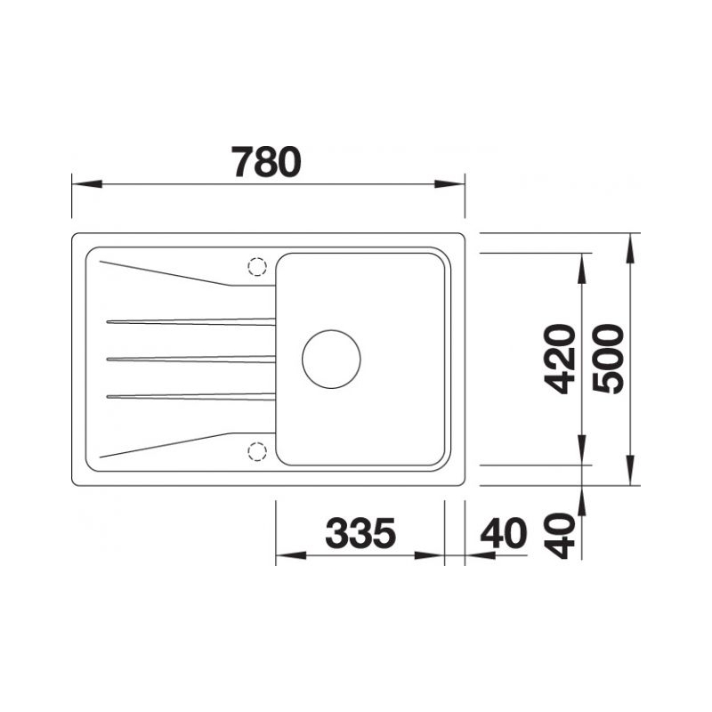 Obojstranný silgranitový drez s priestrannou vaničkou s hĺbkou 190 mm. Ide o jednodrez s odkvapom s rozmermi 780 x 500 x 190 mm a výrezom 760 x 480 mm. Drez je určený výhradne na montáž na dosku s minimálnou šírkou skrinky 45 cm. Dodávka taktiež obsahuje odtokovú armatúru, 3 ½ výpusť so sitkom a 2 predvŕtané otvory.