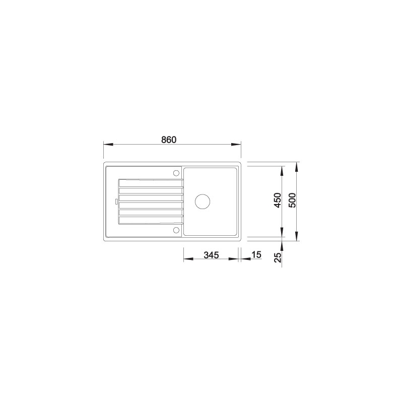 Obojstranný silgranitový drez s priestrannou vaničkou s hĺbkou 190 mm. Ide o jednodrez s odkvapom s rozmermi 860 x 500 x 190 mm a výrezom 840 x 480 mm. Drez je určený výhradne na montáž na dosku s minimálnou šírkou skrinky 45 cm. Dodávka taktiež obsahuje odtokovú armatúru, 3 ½ výpusť so sitkom a 2 predvŕtané otvory.