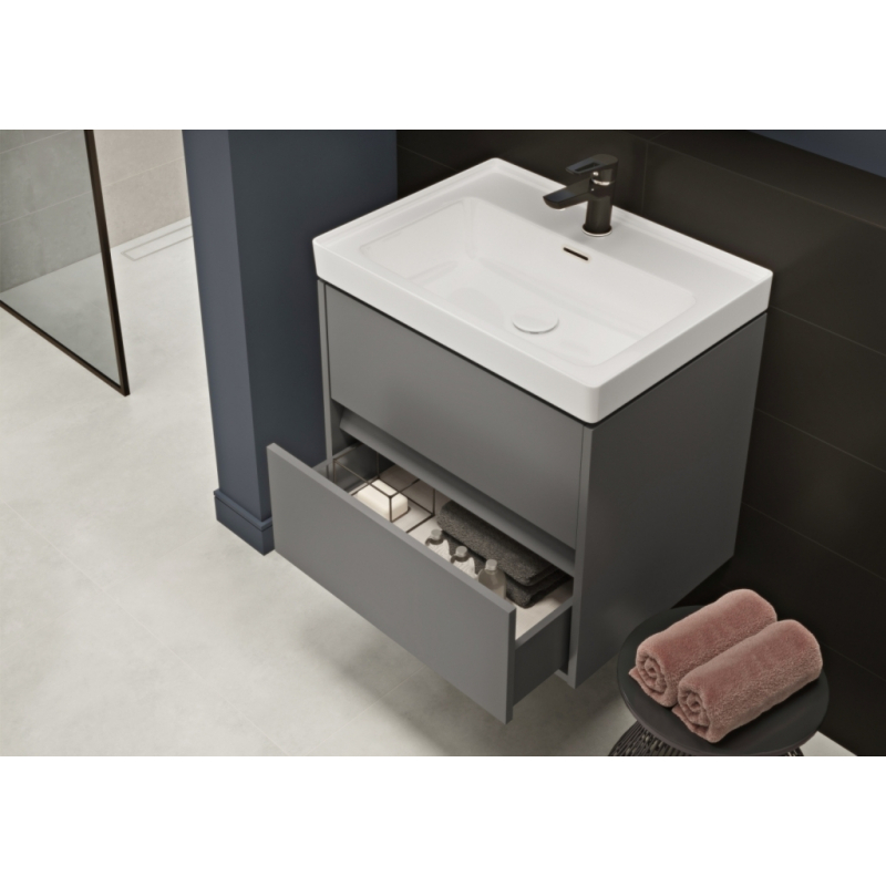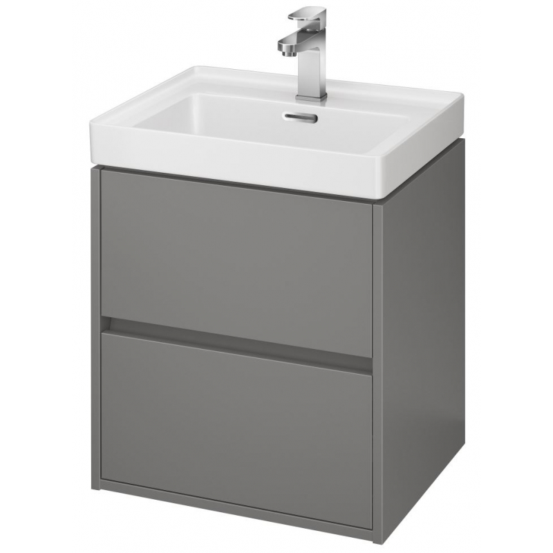 Závesná umývadlová skrinka CREA 50 s dvoma výsuvnými boxmi v šedom prevedení. Je vyrobená modernou technológiou AQUASAFE / zvýšená odolnosť proti vlhkosti /. Skrinka pôsobí elegantným vzhľadom vďaka zapusteniu prednej časti a využitie skrytých madiel.